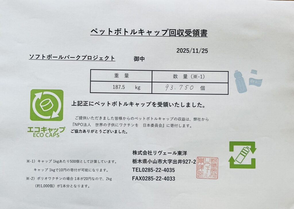 みなさんのご協力によりペットボトルキャップ 93,750個 が集まりました。