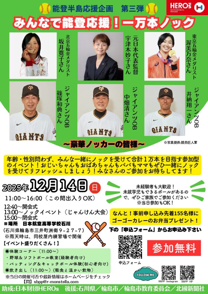 ☆みんなで能登応援!一万本ノック☆北京五輪金メダリストの坂井寛子さん(石川出身)が発起人となって開催する 能登応援企画・第三弾! 【みんなで能登応援!一万本ノック】ご案内 能登の皆さまが復興に向けて懸命に歩んでいらっしゃることに心からの敬意 […]